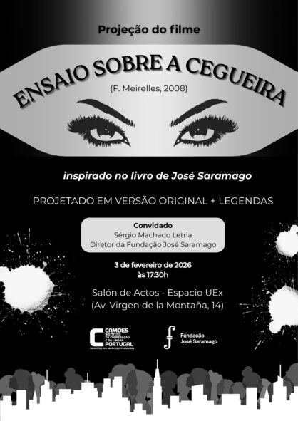 El Centro de Lengua Portuguesa de Cáceres le invita a la proyección de la película «Ensaio sobre a Cegueira» (2008) dirigida por Fernando Meirelles e inspirada en la célebre novela de José Saramago. Esta poderosa adaptación cinematográfica propone una reflexión profunda sobre la condición humana, la fragilidad de la civilización y los límites de la solidaridad, en un mundo totalmente sumergido en la ceguera colectiva. La sesión contará con la presencia especial de Sérgio Machado Letria, Director de la Fundación José Saramago.La película será proyectada en versión original, con subtítulos.